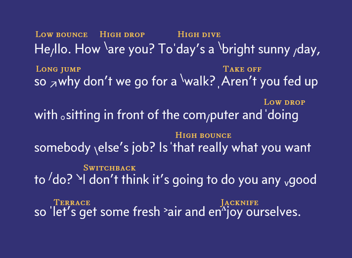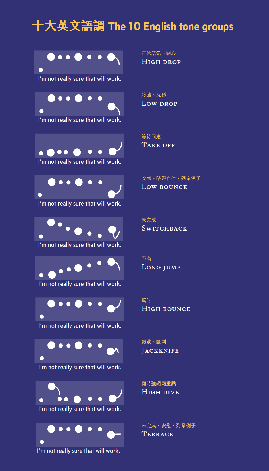 英式文英文有十大語調(The 10 English tone groups),可表達不同語氣,而絕大分課程均不會教授。你可參考圖解及錄音。